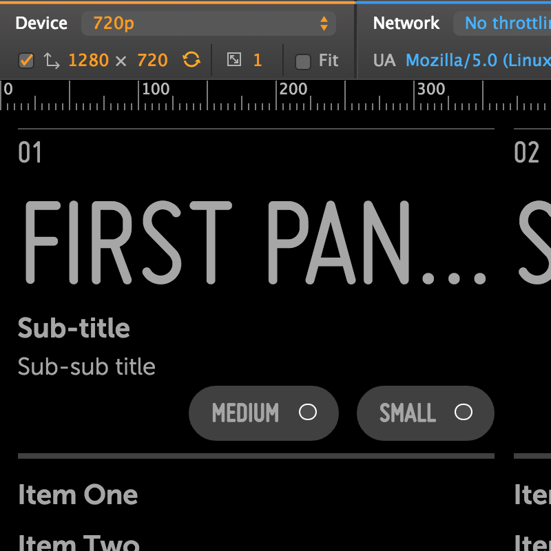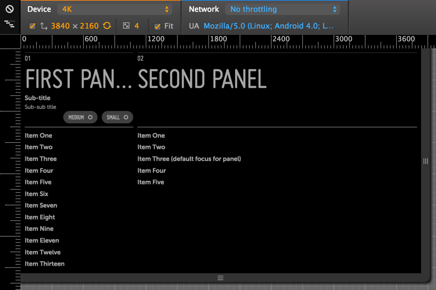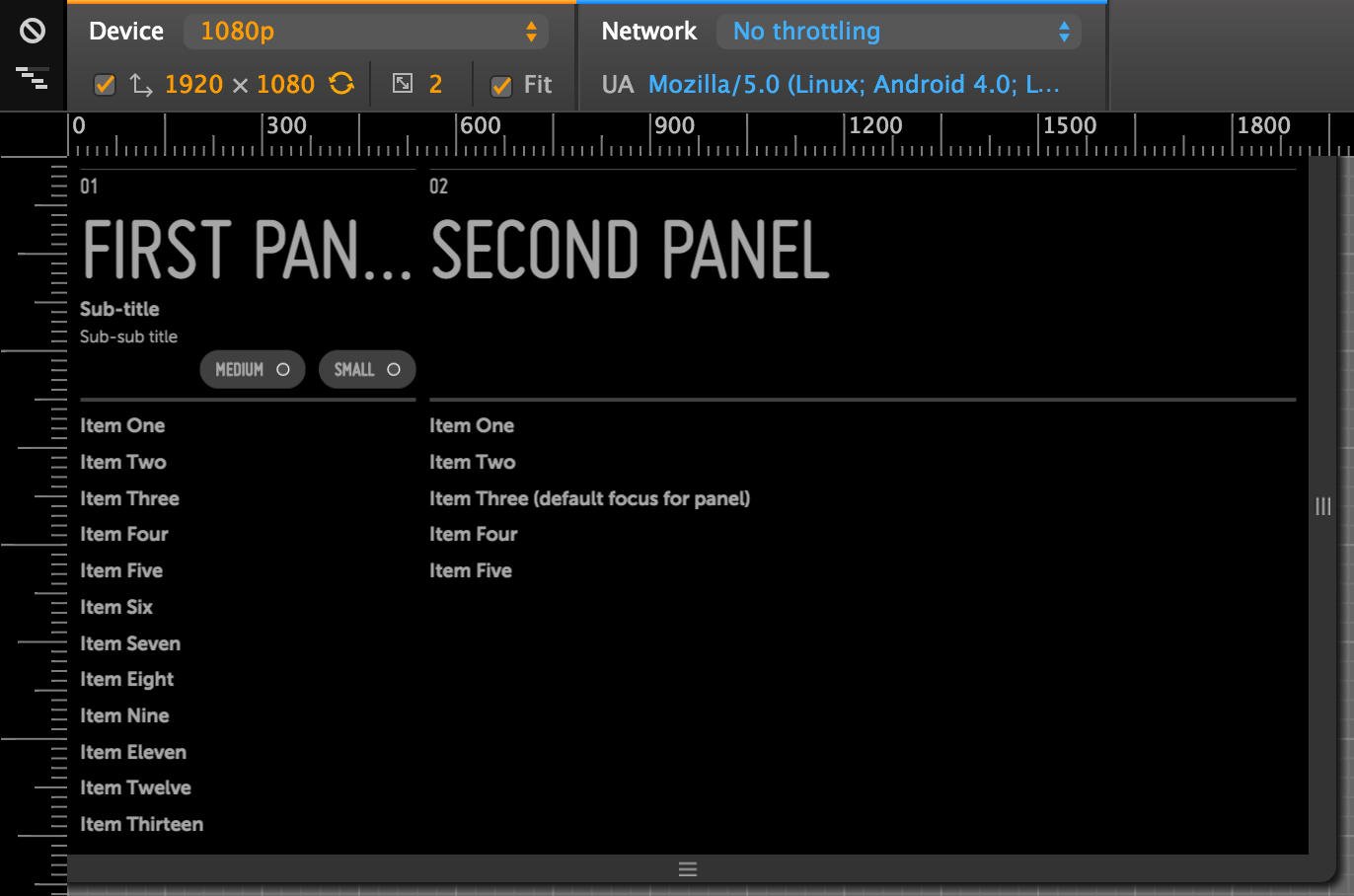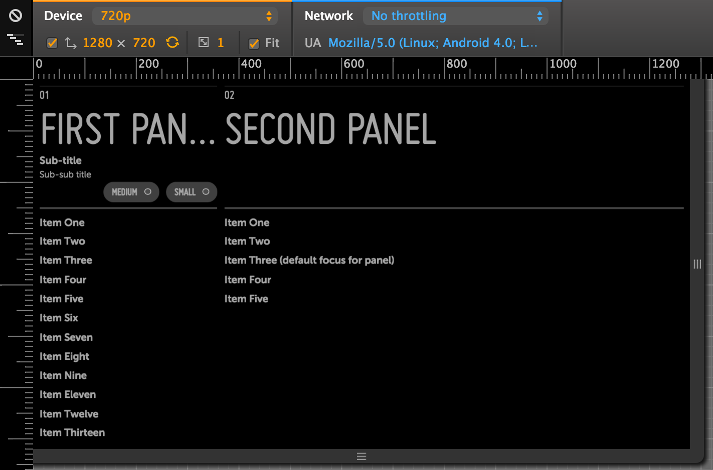 Here's the Moonstone Activity Panels Sample as it appears in the Chrome Web Inspector at various resolutions, with the "Fit" checkbox disabled (click an image to enlarge):