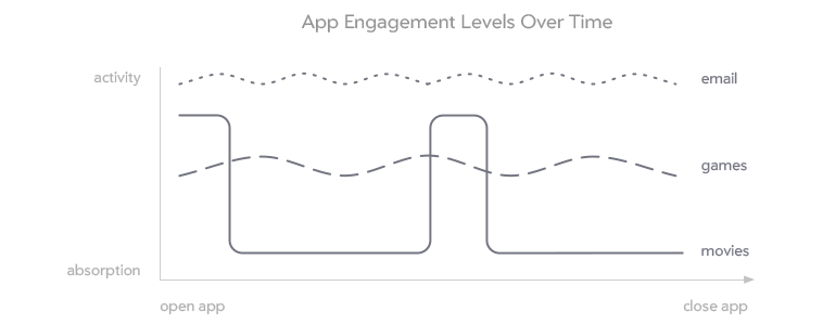 The level of user engagement with an application may also change over time. The image above identifies a movie application as being high-absorption and low-activity. However, when first opening a movie application, the user may want or need to find a new movie to watch. During this time, the level of activity is high and the level of absorption is low. Once the user finds a movie to watch, these levels switch. The user quickly becomes absorbed, and the level of activity remains low until the movie is over.