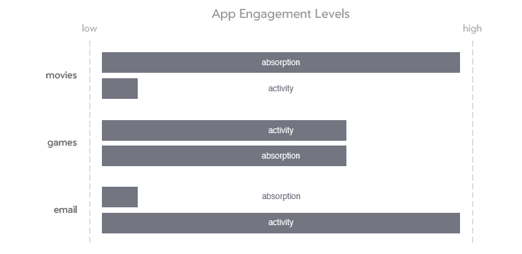 In a high-absorption experience, the user is either passive or thoughtful over a long period of time. Engagement with long-form media such as movies and novels is typically associated with the highest levels of absorption.